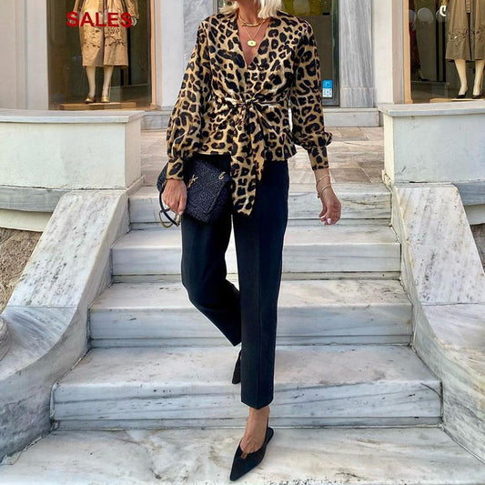 Women's blouse in modern animal print with deep V-neck and waist WW
