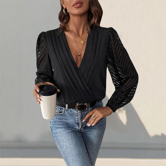 Women's blouse with elegant lace trim and loose puff sleeves WW