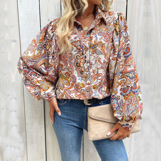 Women's blouse with striking paisley pattern and voluminous puff sleeves WW