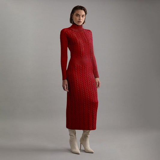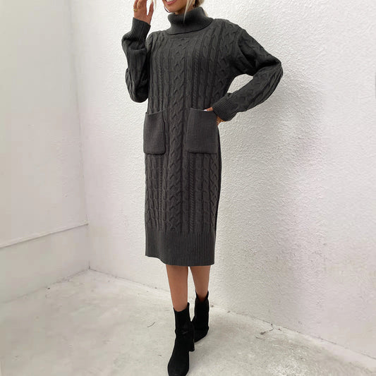 Women's knitted dress with colorful cable pattern and practical pockets WW