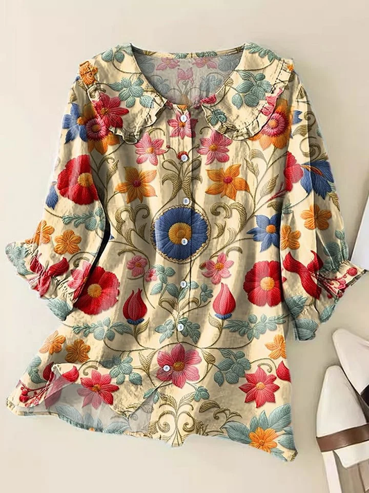 Celine - Women's Vintage Flower Art Print Casual Cotton And Linen 3/4 Sleeve Shirt$54.95 USD$75.00 USD$54.95 USDSale