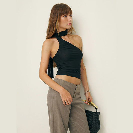 Women's asymmetric T-shirt with skillful cut-out detail and loose knot W&W