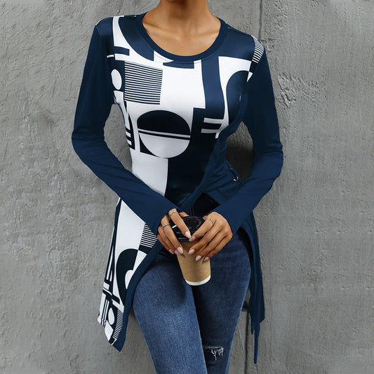 Women's asymmetric long-sleeved shirt with graphic print and fashionable knot WW