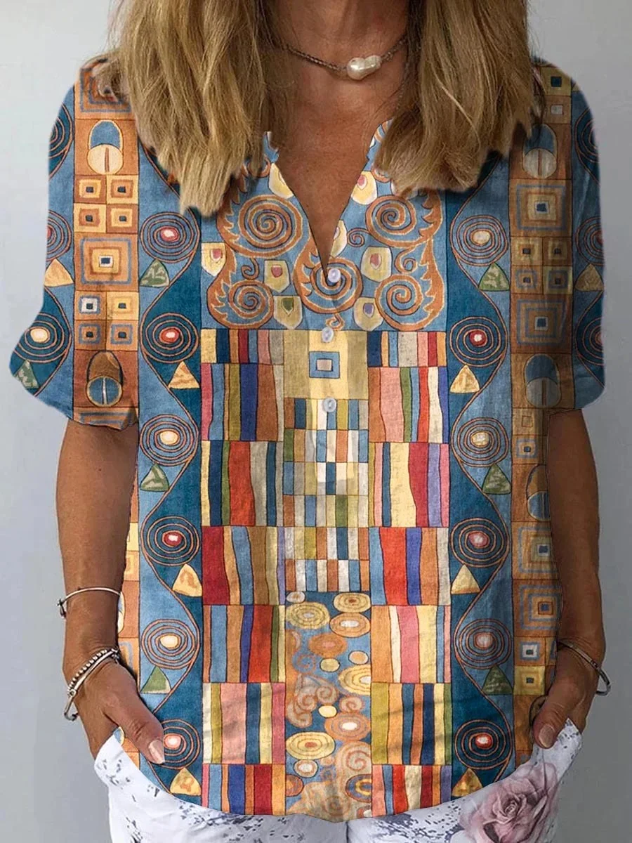 Cara - Women's Abstract Geometric Pattern Art Print Casual Cotton And Linen 3/4 Sleeve Shirt