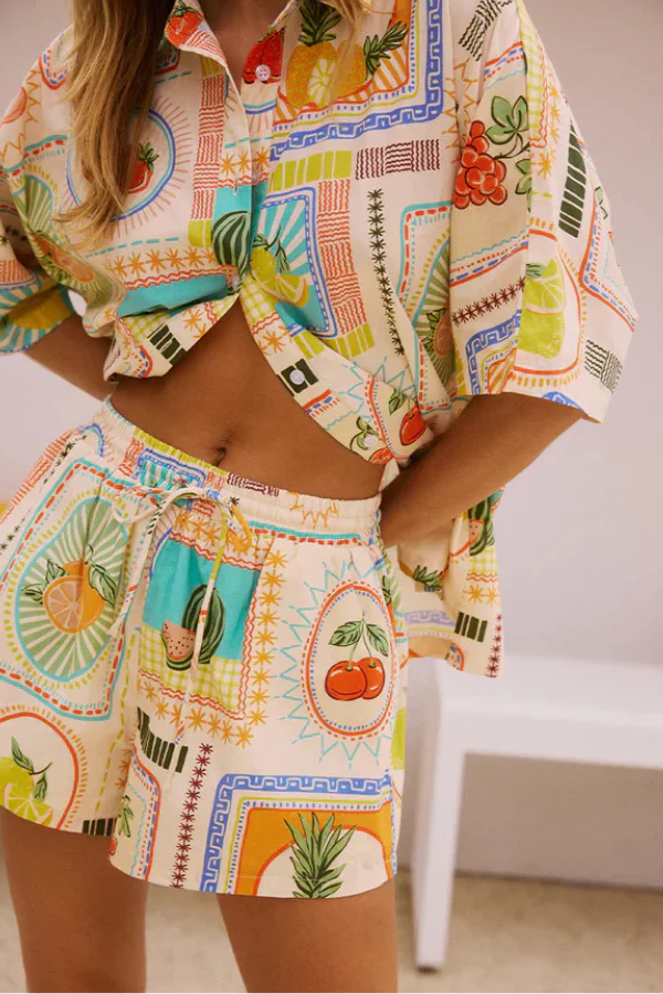 The Savannah Set is a vibrant, playful take on effortless summer style. Featuring a relaxed-fit button-up shirt and matching drawstring shorts, this set is adorned with a fun, retro-inspired fruit and geometric print. The lightweight, breathable fabric makes it perfect for warm days, whether you're lounging by the beach or exploring new destinations.