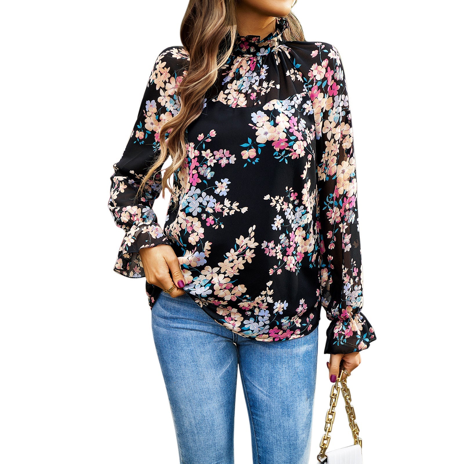 This exquisite women's blouse features a charming floral design that is perfect for any occasion. With its high collar and ruffle details, it offers not only style but also comfort and freedom of movement.